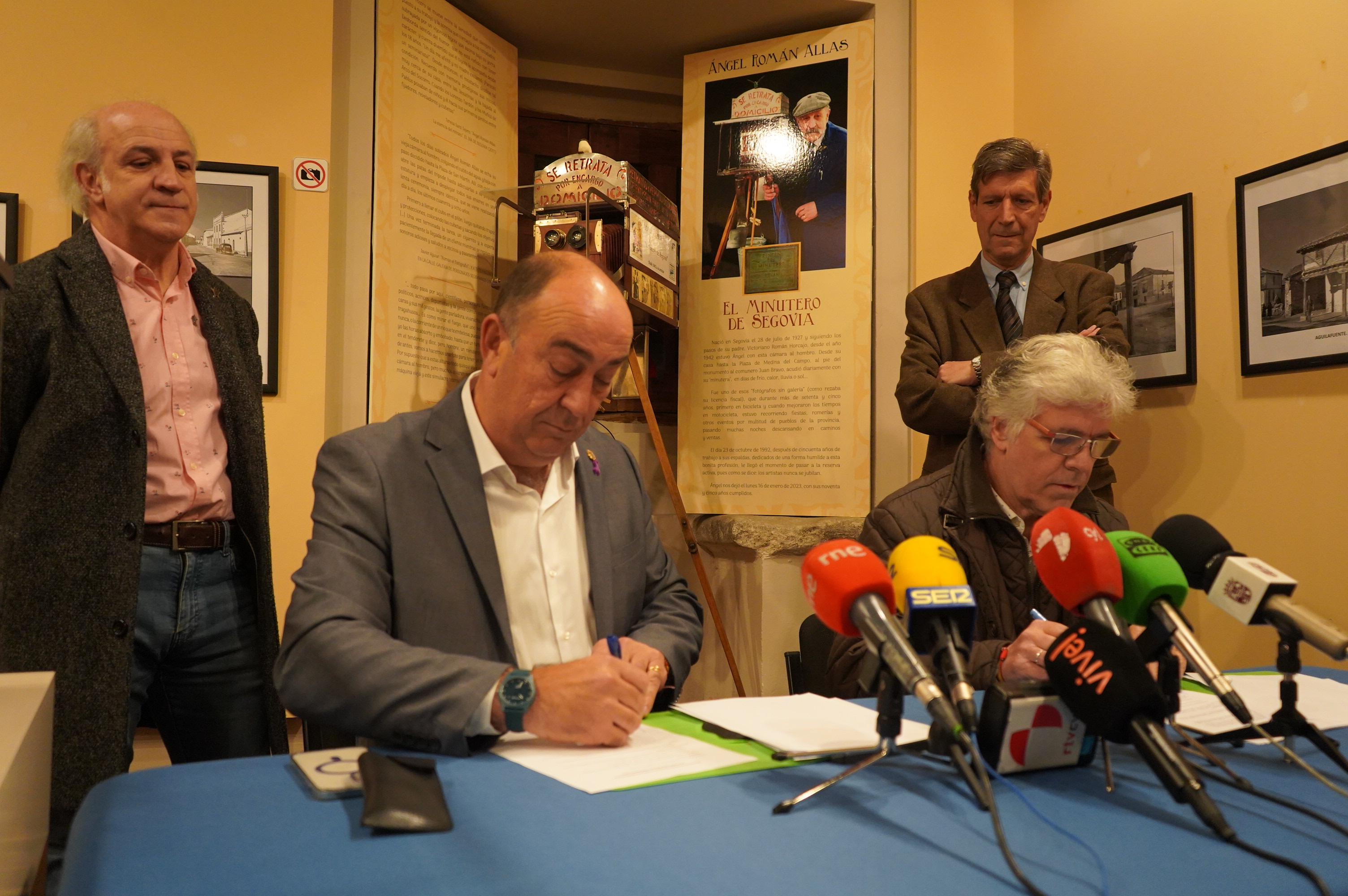Entre los titulares que dejó la última reunión ordinaria del Patronato de la Fundación del Museo Rodera Robles, celebrada en el mes de junio, estaba la aceptación de la cesión de la máquina fotográfica de ‘El Minutero de Segovia’, Ángel Román, que hoy se ha hecho efectiva en un breve acto en el que, además del presidente de la Diputación y presidente de la Fundación, Miguel Ángel de Vicente, y del secretario de la misma y director del Museo, Rafael Cantalejo, han estado presentes los hijos de ‘El Minutero’, Ángel Román y Javier Román.